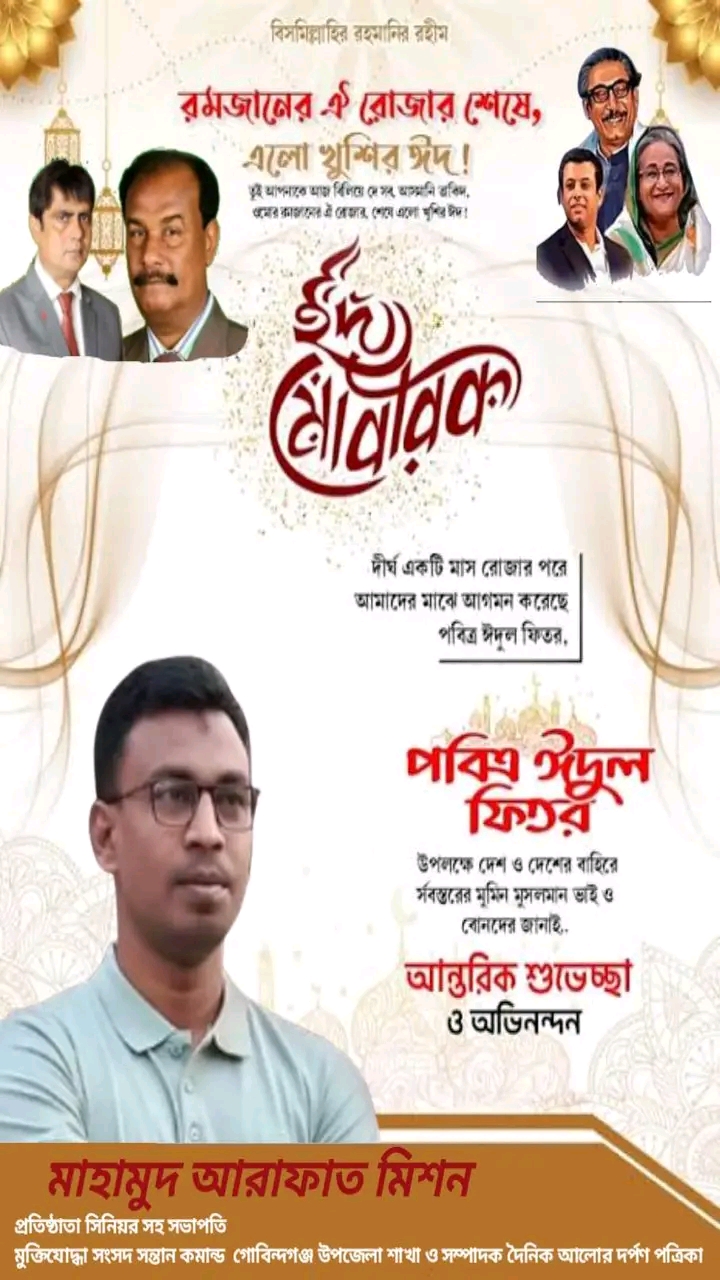 তিনি বলেন প্রিয় দেশবাসী আসসালামু আলাইকুম সবাইকে আসন্ন ঈদুল ফিতরের শুভেচ্ছা ঈদ মোবারক চলুন ধনী-গরীব ধর্ম-বর্ণ নির্বিশেষে সকলে মিলে দীপ্ত কণ্ঠে আওয়াজ তুলি বেকার মুক্ত দেশ গড়ি সেই সাথে দৈনিক আলোর দর্পণ পত্রিকায় সংবাদ পাঠ করে এবং সংবাদ দিয়ে সাথে থাকার আহ্বান জানায়